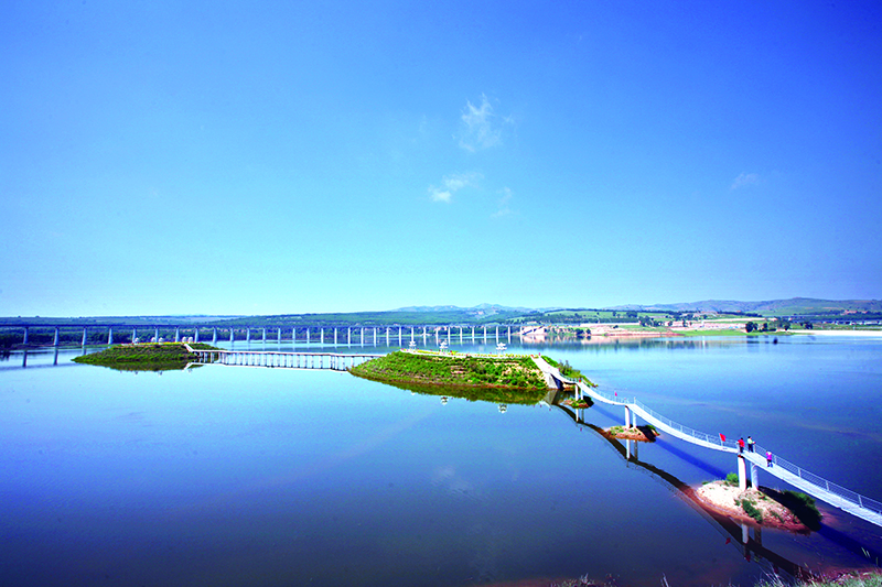 海子灣水庫的水清澈透明,水面視野開闊,有深水區(qū)也有淺水區(qū),水中野生魚成群嬉鬧,水面有水鳥珊珊飛舞,周圍群山綿延,森林繁茂,綠化率達90%。景區(qū)擁有優(yōu)質的水體、茂密的植被和種類繁多的生物,野生動物有石雞、山鷹、狗獾等50余種,林業(yè)資源有小葉楊、樟子松、沙棘等30余種,草本類植物有針茅、冰草、老芒麥等300余種。水面中間坐落一半島,若隱若現(xiàn),游客可蕩舟戲水、可垂釣觀魚、亦可登高放歌,周邊溪流縱橫,匯聚了水草、蘆葦以及水禽等多種自然景觀。