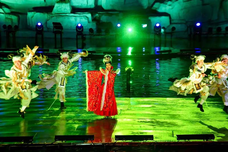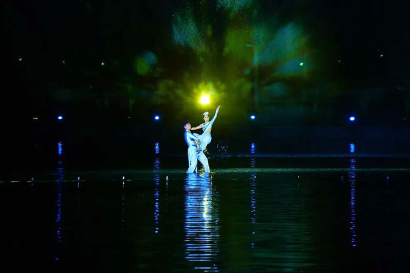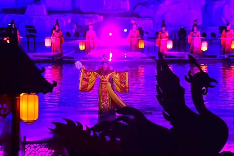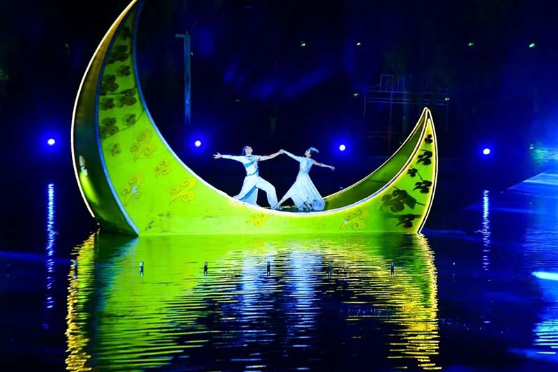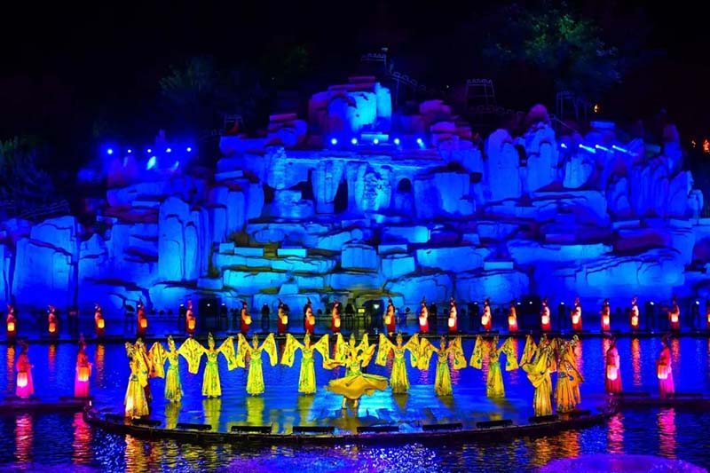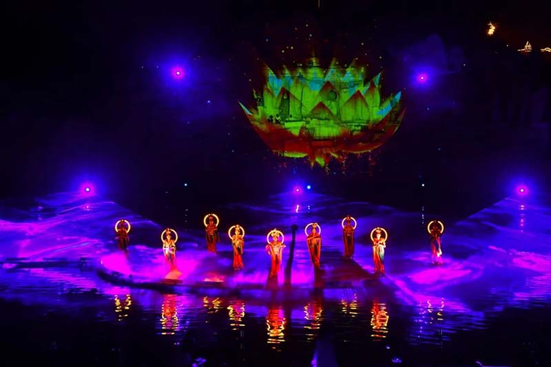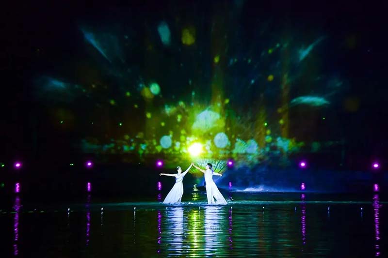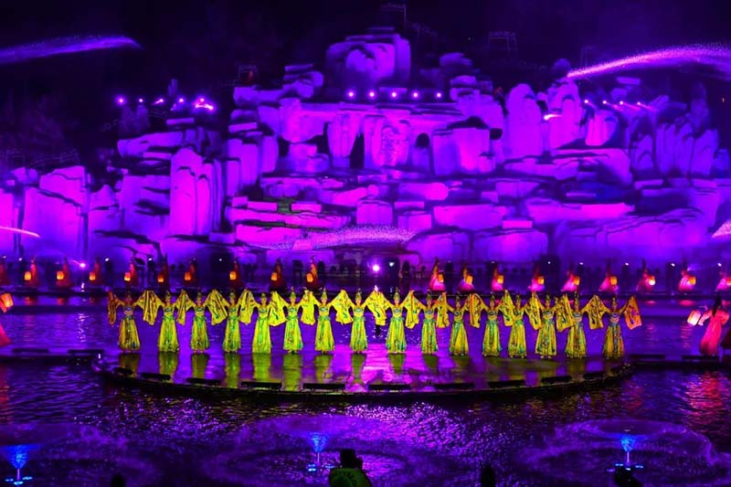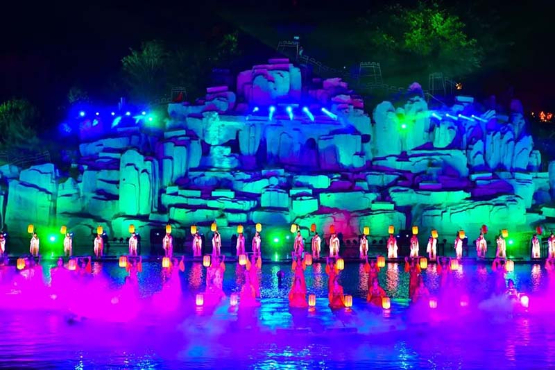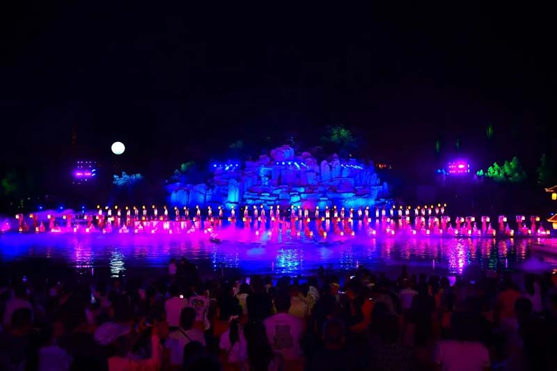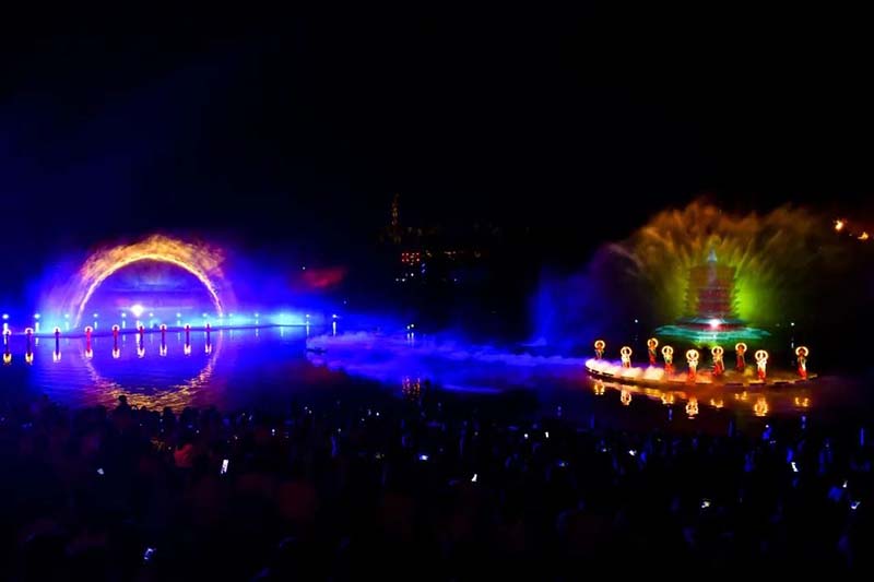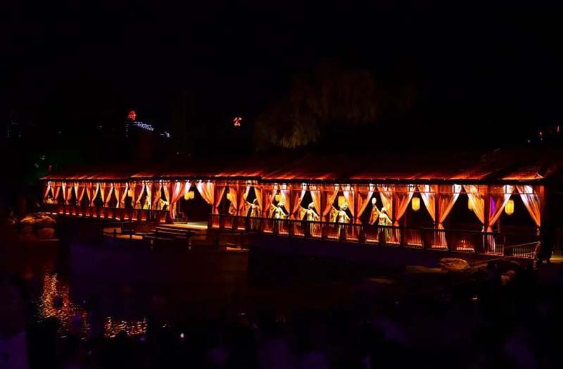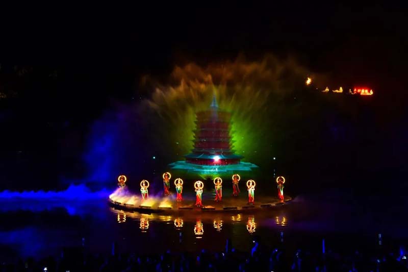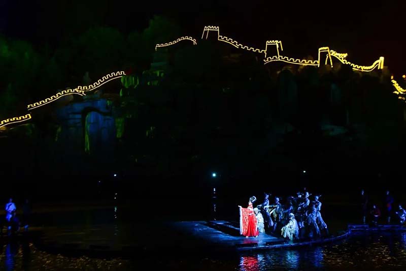 《尋夢(mèng)桑源》依托厚植的馬邑文化和源遠(yuǎn)流長(zhǎng)的桑干河,將自然景觀與人文歷史融合,以聲、光、電等現(xiàn)代技術(shù)為手段,在湖光山色、燈光水影中,創(chuàng)造出如詩(shī)如夢(mèng)的視覺(jué)效果,給觀眾帶來(lái)浪漫唯美的沉浸式體驗(yàn)。演出共分為《馬邑傳奇》《班姬團(tuán)扇》《昭君出塞》《平安之神》《千秋忠勇》《神工峻塔》《老城往事》《月上長(zhǎng)城》《青山綠水》《朔城力量》十幕。