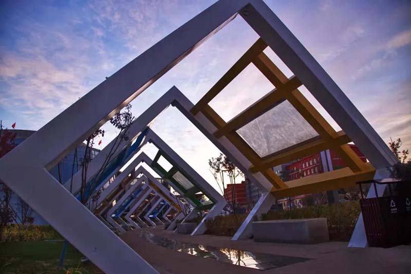 五步一柱、十步一景,噴泉外圍放置了雕刻著金城、馬邑、峙峪字樣的巖石,象征著朔州歷史上的光輝節(jié)點。不規(guī)則的鐵架長廊藝術氣息十足,游人可在其間散步或駐足,偶遇一份文靜淡雅,或邂逅倏忽而至的靈感。在這里,建筑與地域文化相融,珍藏著獨屬于朔州的文化浪漫。