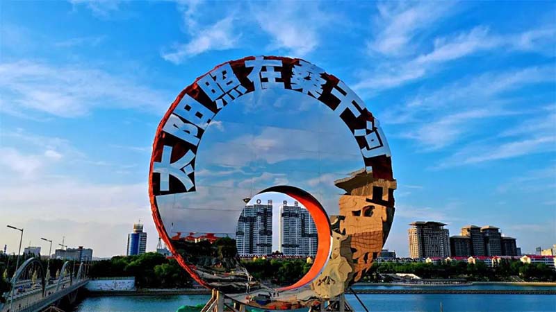 為了活化“太陽照在桑干河上”這一美景,清華美院展示藝術研究所精心設計,將“太陽”作為主體意象進行打造,雕塑中央部位圓形孔洞寓意“朔”與新月,象征城市高質(zhì)量發(fā)展的新起點。整體巧妙地融主題性、紀念性、裝飾性、標志性、藝術性等特色于一體,寓意太陽從桑干河畔冉冉升起,昭示著希望與未來,激人奮進。
